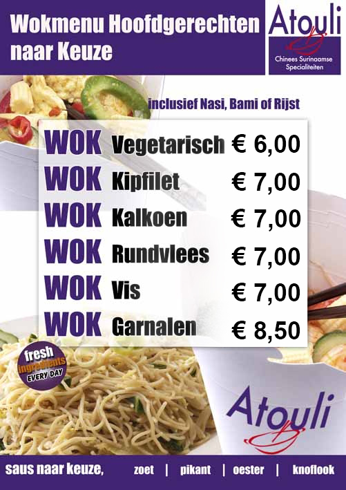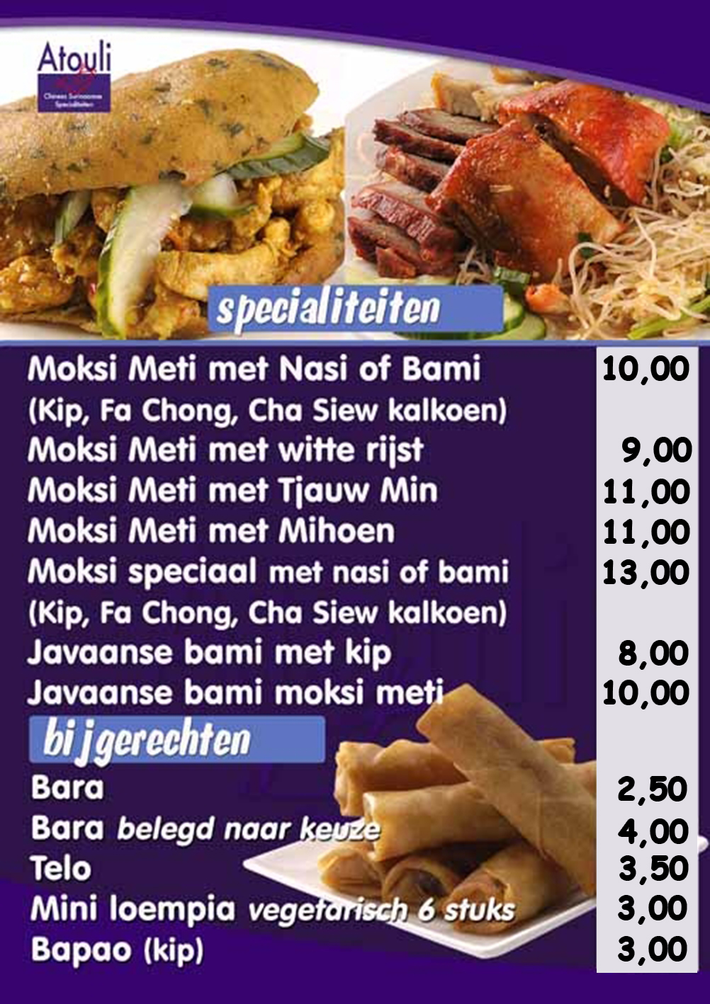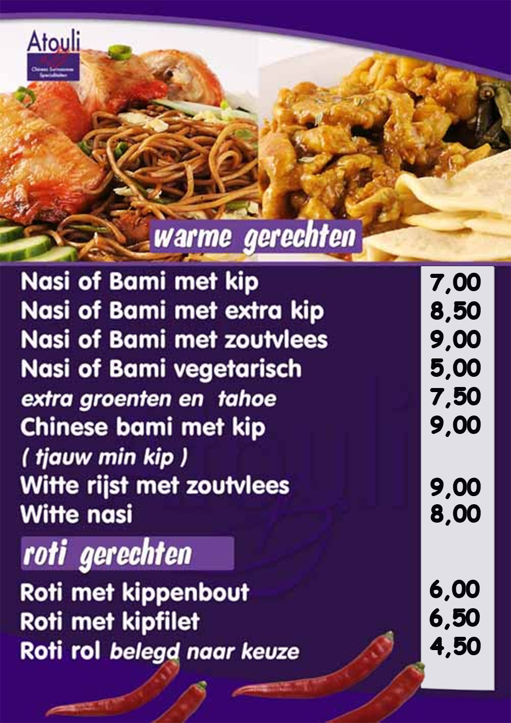 Kom eens langs bij ons afhaalpunt voor onze heerlijke, Chinese en Surinaamse gerechten! Wij hebben vele gerechten waaruit u kunt kiezen. De verschillende gerechten worden ter plekke voor u klaargemaakt door onze professionele koks. Voor de diverse gerechten maken wij gebruik van verse ingrediënten zodat onze gerechten altijd zo vers en lekker mogelijk zijn.